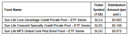 SLGI Asset Management Inc. (Sun Life Global Investments) has declared the following regular cash distributions for the month ending Jan. 30, 2026, in respect of the exchange-traded series of units of funds managed by Sun Life Global Investments, as set out in the table below. Unitholders of record on Jan. 23, 2026, will receive cash distributions for the respective ETF series payable on Jan. 30, 2026.