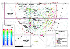 Initial geochemical results have identified strong copper anomalies hosted within volcanic sequences affected by widespread potassic alteration, indicative of shallow, potentially high-grade copper mineralization that warrants detailed follow-up. At Tinki South, a systematic soil sampling programme was completed on a 100-metre grid, defining two significant copper anomalies: