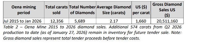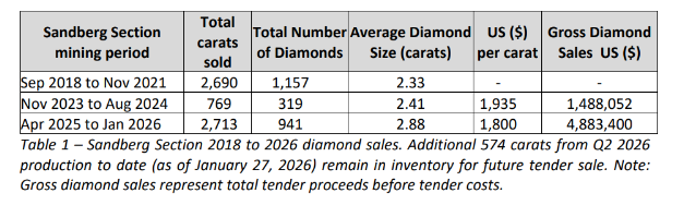 Gross diamond sales (total tender proceeds before tender costs): approximately $1.90-million (U.S.), a 29-per-cent increase over Q4 2025;