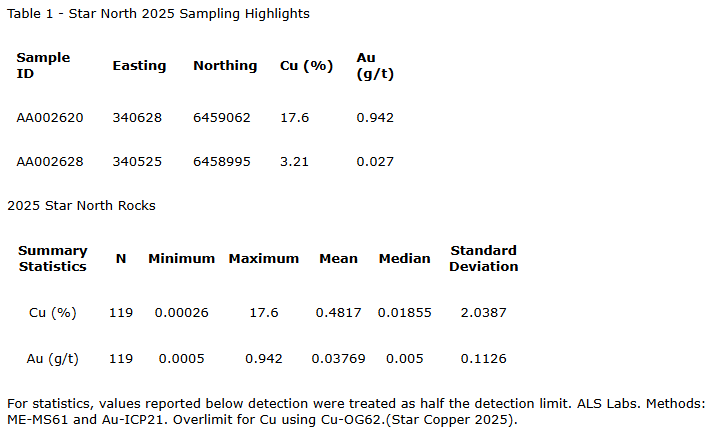 Star Copper implements a robust QA/QC program, including the insertion of a minimum 5 per cent certified reference materials (standards), blanks and field duplicates at regular intervals into the sample stream to monitor analytical accuracy and precision. The performance on the blind standards, blanks and duplicates achieved high levels of accuracy and reproducibility and has been verified by Jeremy Hanson, a qualified person as defined by National Instrument 43-101.