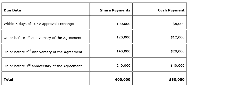 The agreement and proposed share issuances remain subject to approval by the TSX Venture Exchange. All security issuances will be subject to a statutory hold period of four months and one day from issuance in accordance with Canadian securities laws. No finders' fees were paid on this agreement.