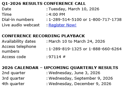 On Tuesday, March 10, 2026, Transcontinental will also release its first quarter 2026 results. The financial results will be made public in a press release that will be issued on the news wire as well as in the management's discussion and analysis that will be posted on the corporation's website.