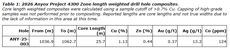 (1.1 per cent Cu, 0.4 per cent Zn, 0.37 g/t Au, 13.2 g/t Ag and 124 ppm Co). This new intersection represents an 80-metre stepout to the south from ANY-25-002 and now traces the 4300 zone over a drill-defined strike of approximately 130 metres. The 4300 zone occurs at a vertical depth of 900 metres below surface or 700 metres downdip below the lowest level of the past-producing Hidden Creek mine.