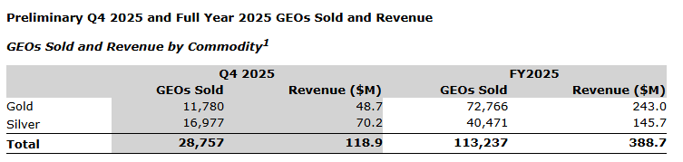 Triple Flag Precious Metals Corp. had record quarterly revenue of $118.9-million for the fourth quarter of 2025 from quarterly metal sales of 28,757 gold equivalent ounces (GEOs). For full-year 2025, Triple Flag announced record revenue of $388.7-million and record GEOs of 113,237, achieving the top half of GEOs guidance. All dollar amounts are expressed in U.S. dollars, unless otherwise noted.