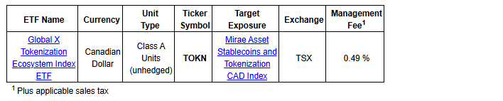 "The shift toward tokenization and stablecoins represents the next generation of financial technology, and we're already seeing meaningful implementation under way across global financial markets," said Ken Chen, senior analyst, portfolio manager, index strategies, at Global X. "Our TOKN ETF was built for Canadian investors seeking diversified exposure to the companies building the infrastructure and platforms supporting the future of finance, from trading and distribution to payments, settlement and custody."