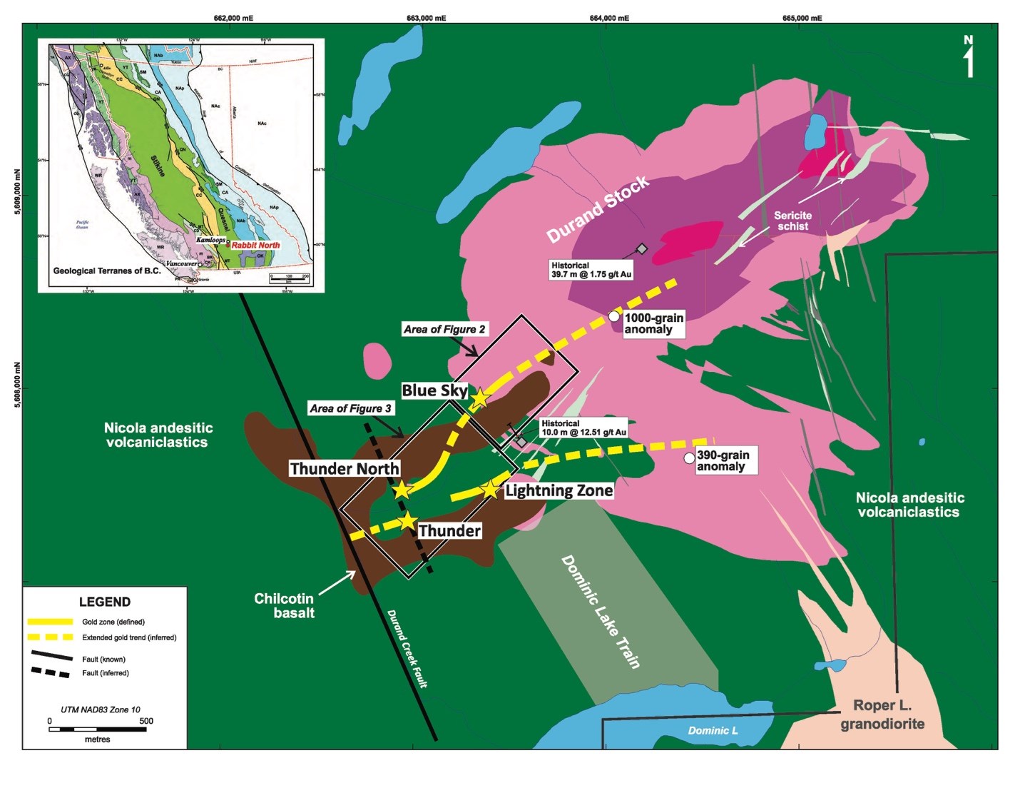 Figure 1 - Geology of the central part of the Rabbit North property showing the major shear structures controlling Tower's gold discoveries. These shear zones are roughly coincident with more recent graben fault valleys that have been infilled by Chilcotin basalt flows.
