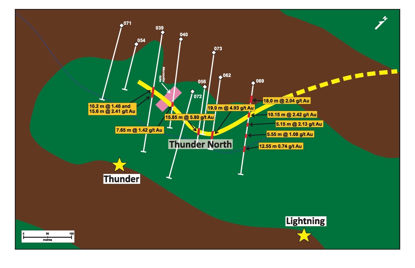 Hole 069 at Thunder North intersected three shallow (starting just 30 m below surface), wide (18.0, 10.15 and 5.15m), closely spaced (within a 97 m core span), bands of typical Thunder North-style mineralization averaging 2.04, 2.42 and 2.13 g/t, respectively (see Table 1 and Fig. 3). Importantly, the positions of these intersections indicate either bending or faulting of the Thunder North zone northward under the cover rocks, directly in line with and only 400 m from Blue Sky. Hence, step-out drilling to the northeast through the cover rocks can reasonably be expected to establish continuity between the two gold zones.