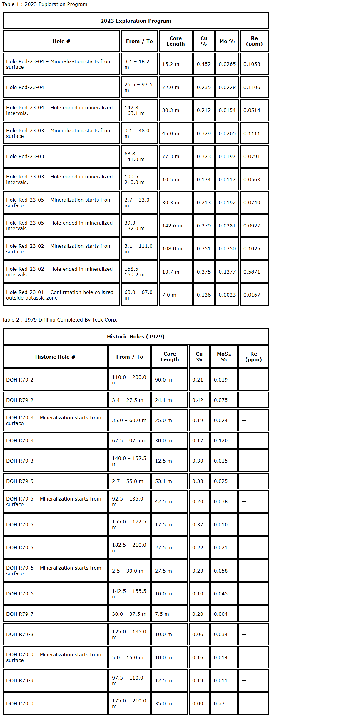However, the author of the 2024 Redonda NI 43-101 technical report does note, "The remaining drill core from 1979 drill-hole R-79-2 was located and the core was quartered and the 2023 assays compared closely with the 1979 results."