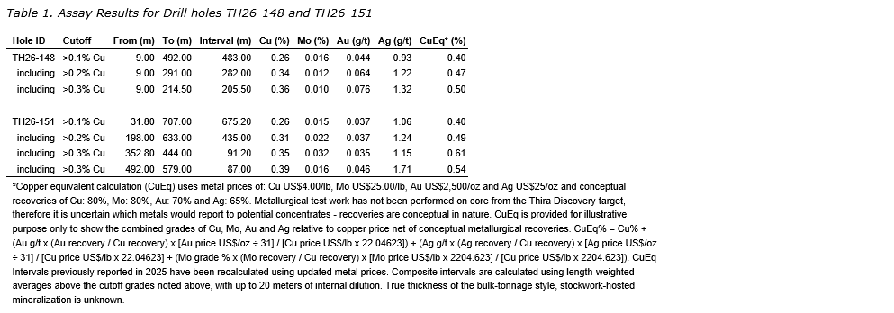 Drill hole TH26-151 intersected the longest interval of continuous porphyry-related copper-molybdenum mineralization drilled to date at the Thira discovery. Results from drill hole TH26-151 build on results from 2025 and demonstrate that mineralization extends for at least 800 metres (m) east-west and at least 700 metres north-south where it remains open.