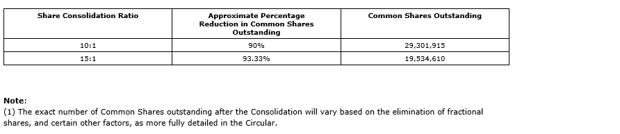 The company's board of directors is seeking shareholder approval to implement the consolidation because it believes that the resultant increase to the trading price of the common shares from effecting the consolidation could potentially, and principally, broaden the pool of investors that may consider investing or be able to invest in the company.