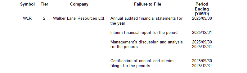 A cease trade order was issued by the British Columbia Securities Commission on March 31, 2026, against Walker Lane Resources Ltd. for failing to file the documents indicated in the attached table within the required period.