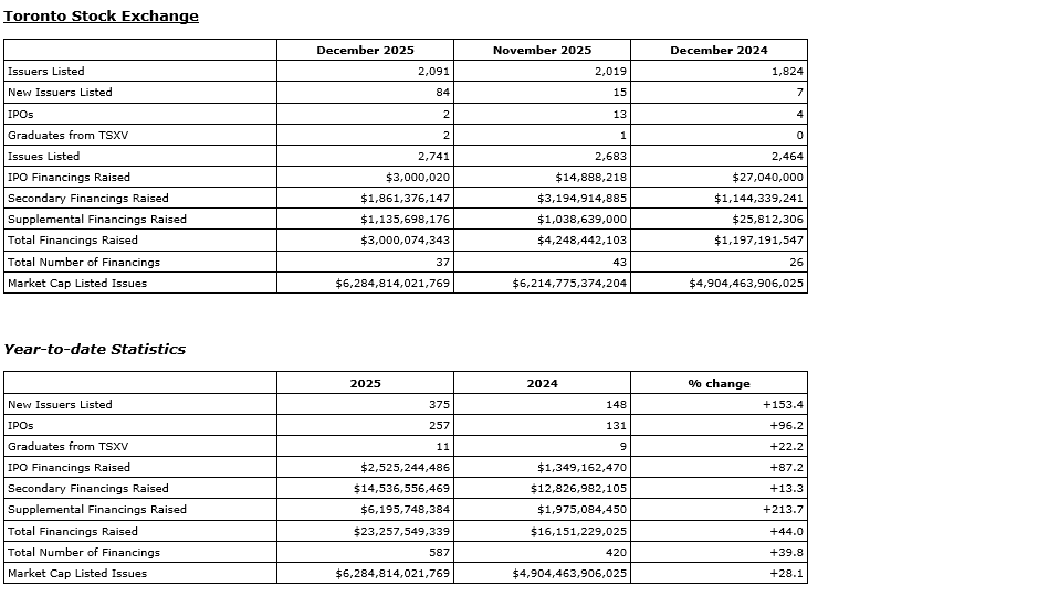 TMX Group Ltd. has released the financing activity statistics on the Toronto Stock Exchange and TSX Venture Exchange for December, 2025.