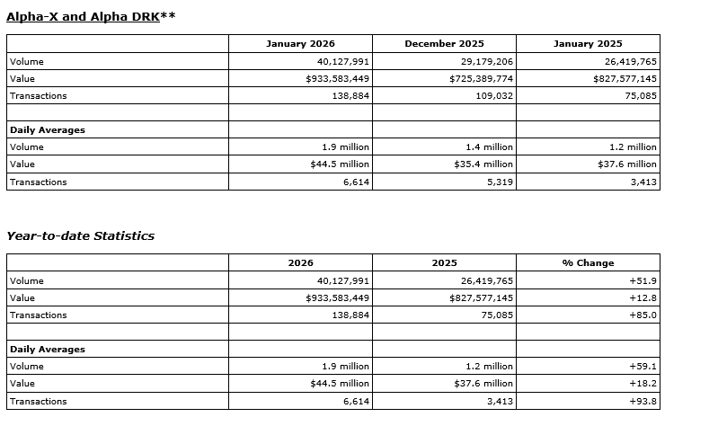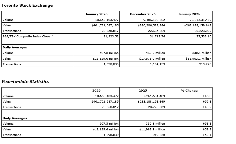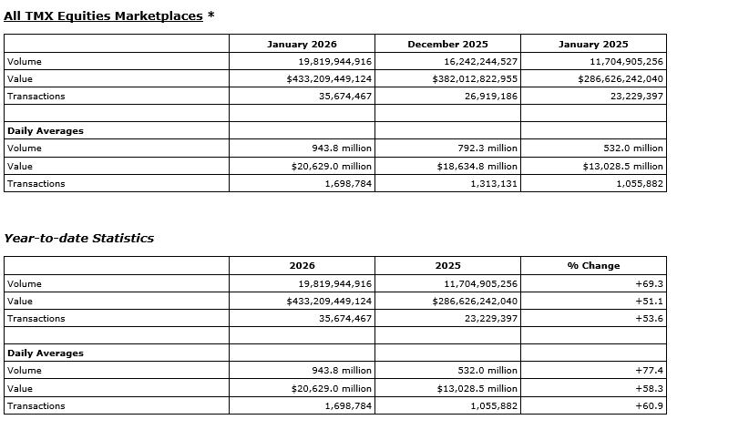TMX Group Ltd. today released January, 2026, trading statistics for its marketplaces -- the Toronto Stock Exchange, TSX Venture Exchange, TSX Alpha Exchange (Alpha), including Alpha-X and Alpha DRK, and Montreal Exchange (MX).