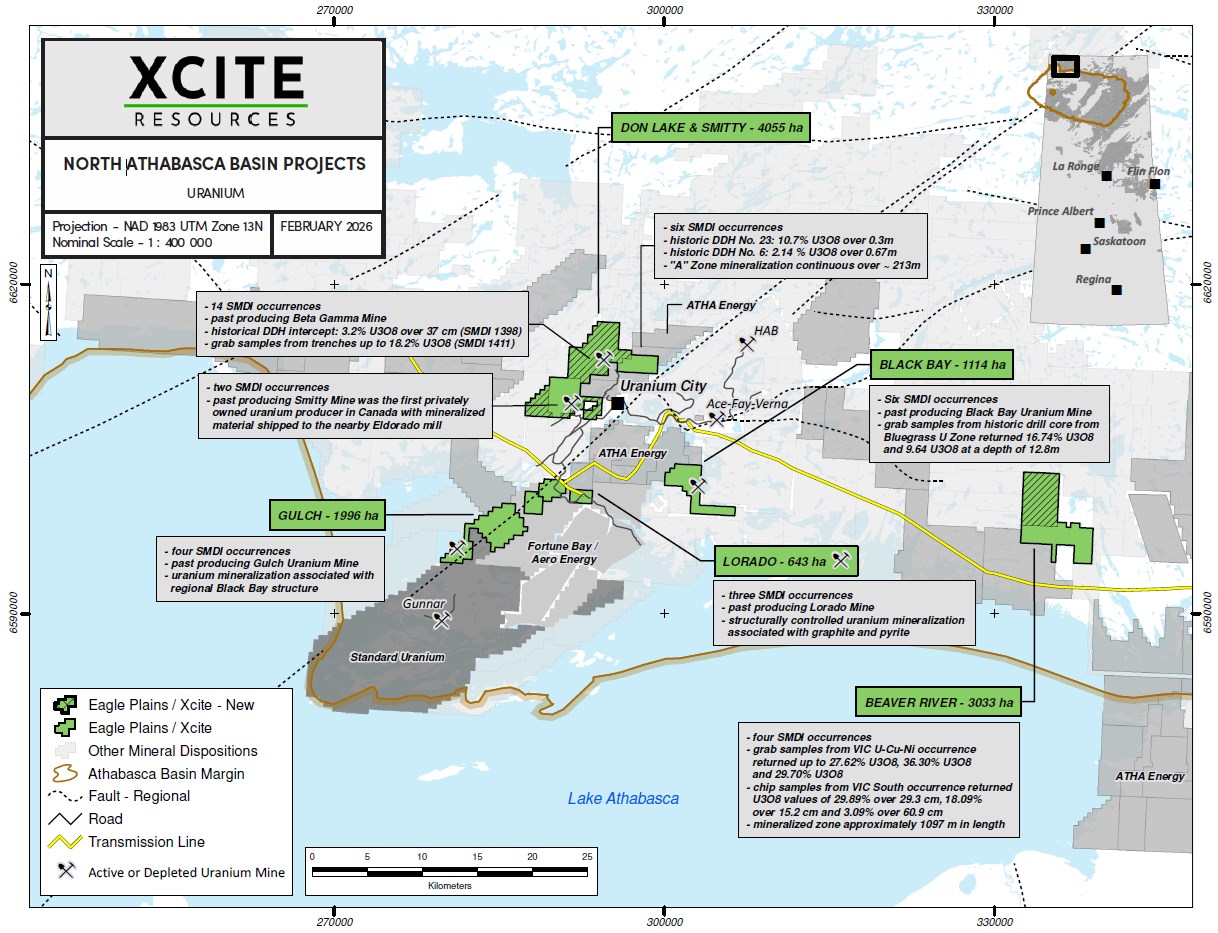 Vancouver, British Columbia--(Newsfile Corp. - February 19, 2026) - Xcite Resources Inc. (CSE: XRI) ("XRI", "Xcite"or the "Company") is pleased to announce the inclusion of seven dispositions recently acquired by staking in the Uranium City area, northern Saskatchewan by Eagle Plain. The dispositions fall within an Area of Mutual Interest ("AMI") and as such, will become included in the Don Lake, Smitty and Beaver River projects respectively. The Don Lake - Smitty projects are now contiguous with an additional 2649ha of claims bringing the total area to 4055ha. The Beaver River project has added 1578ha, for a total of 3033ha.