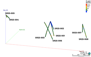 Hole SR25-006 south of the F2 vein area is thought to be separated by an offsetting fault intersected three 1.5-metre-long intervals of elevated zinc between 2.4-3.4% within brecciated and veined intervals hosted in phyllitic and calcareous metasediments. These results together indicate a multiphase polymetallic hydrothermal system within the F2 corridor.
